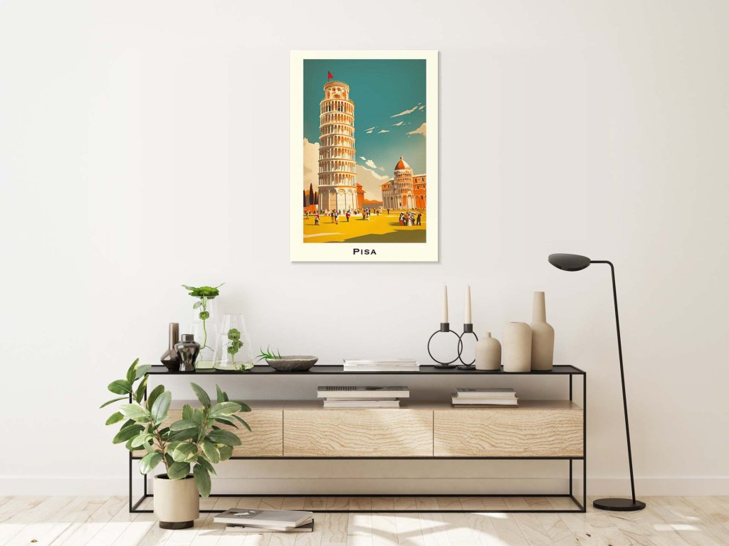 Na obraze je zobrazený slávny komplex so Šikmou vežou a katedrálou v meste Pisa, v idylickom prostredí so sviežou oblohou a oblakmi. Turisti sú vidieť, ako sa prechádzajú a fotia okolo veže, čo dodáva scéne živosť a atmosféru miesta plného histórie. Farebná paleta využíva teplé odtiene, ktoré zvýrazňujú architektúru a taliansku atmosféru.