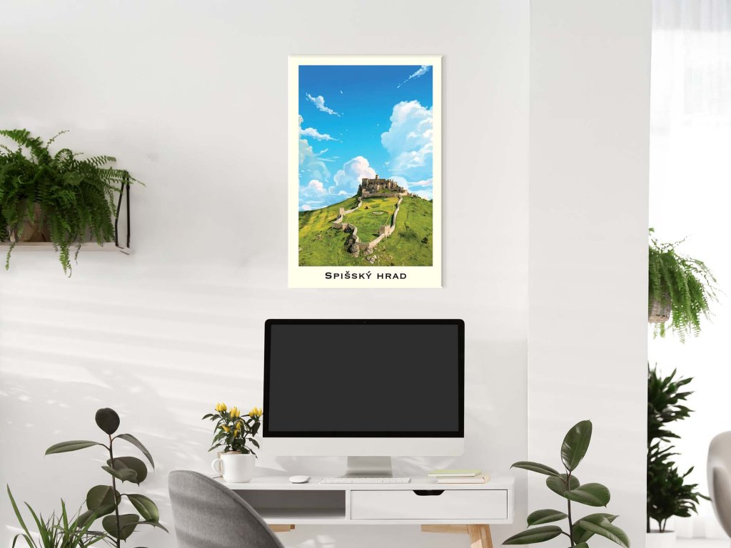 Obraz zachytáva rozľahlý Spišský hrad rozprestierajúci sa na vrchole zeleného kopca pod jasným modrým nebom s oblakmi. Hrad, obklopený mohutnými múrmi a vežami, pôsobí impozantne a zároveň harmonicky zasadený do okolitej krajiny. Tento pohľad evokuje pocit histórie a pokoja, čím zdôrazňuje kultúrnu hodnotu a krásu slovenského dedičstva.