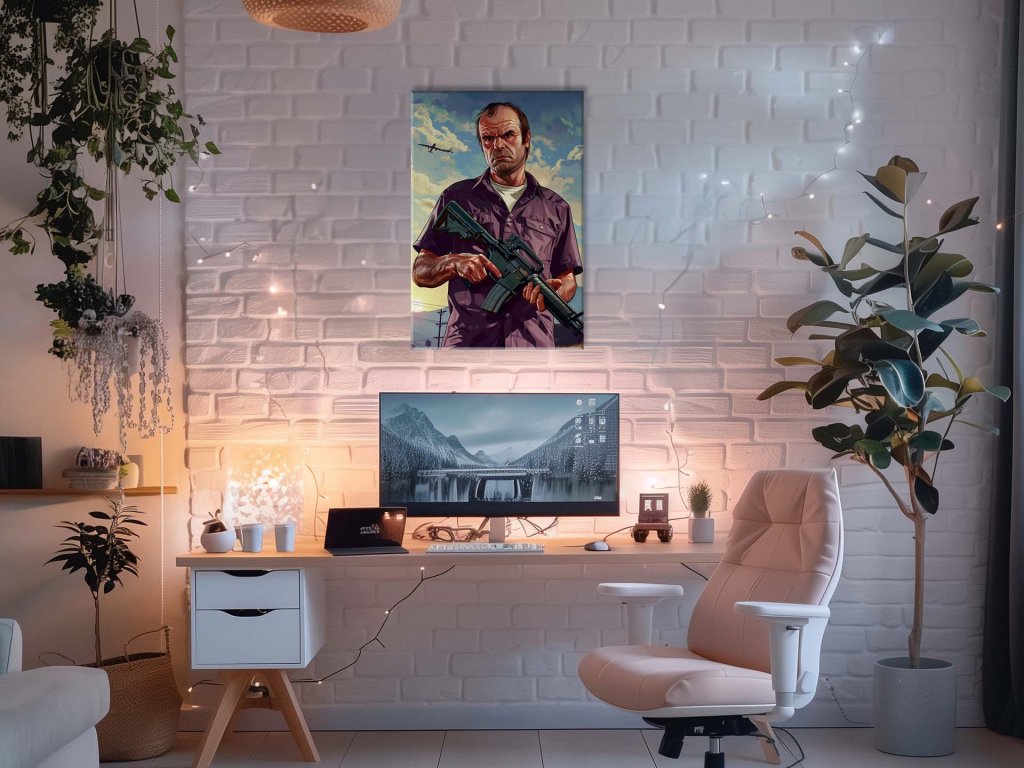 Tento obraz zobrazuje rozhodného muža, ktorý pevne drží zbraň, pričom v pozadí je modrá obloha s lietadlom. Jeho výraz tváre odráža odhodlanie a pripravenosť čeliť akýmkoľvek výzvam. Scéna je dynamická a nabitá energiou, evokujúc napätie a akčnú atmosféru.