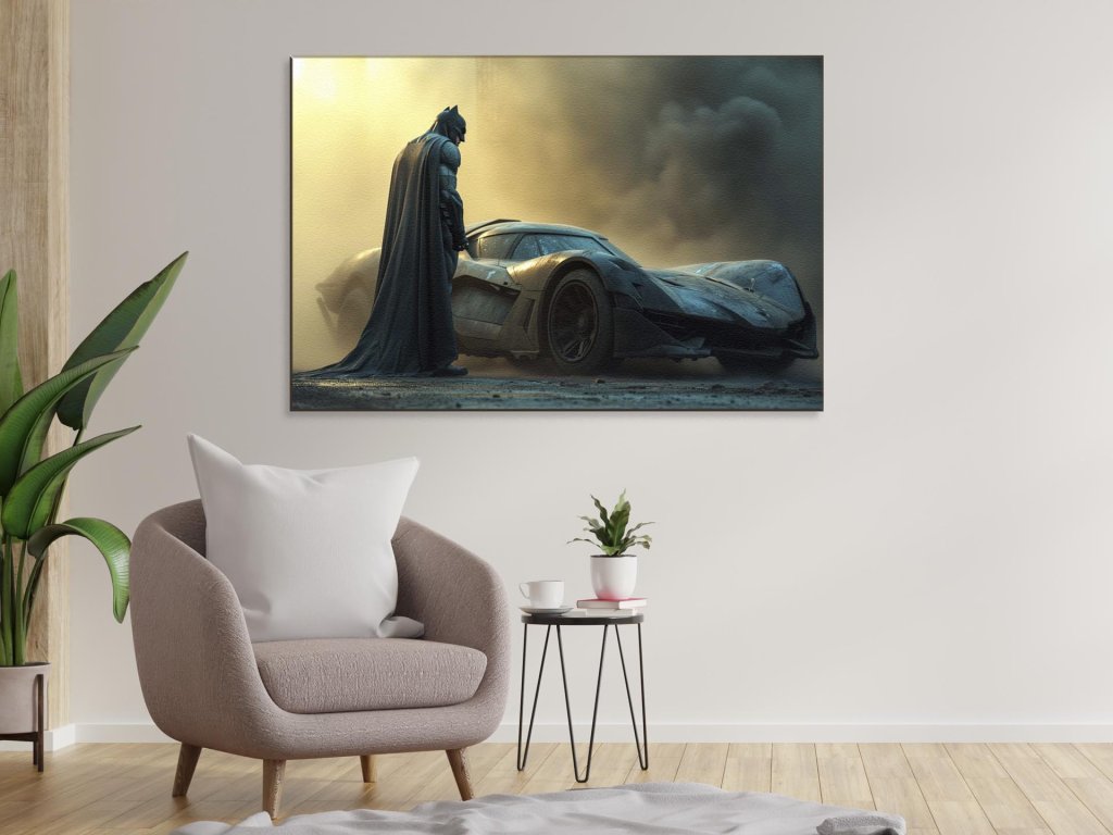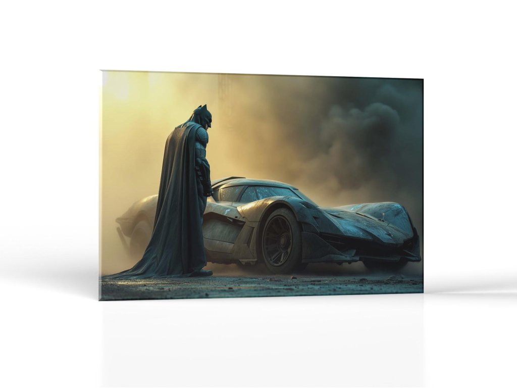 Mysteriózna postava v tmavom obleku s plášťom hľadí na futuristické vozidlo v prachu. Osvetlenie zdôrazňuje dramatickú atmosféru scény, kde sa siluety postavy a vozidla odrážajú na pozadí dramatických farieb okolia.