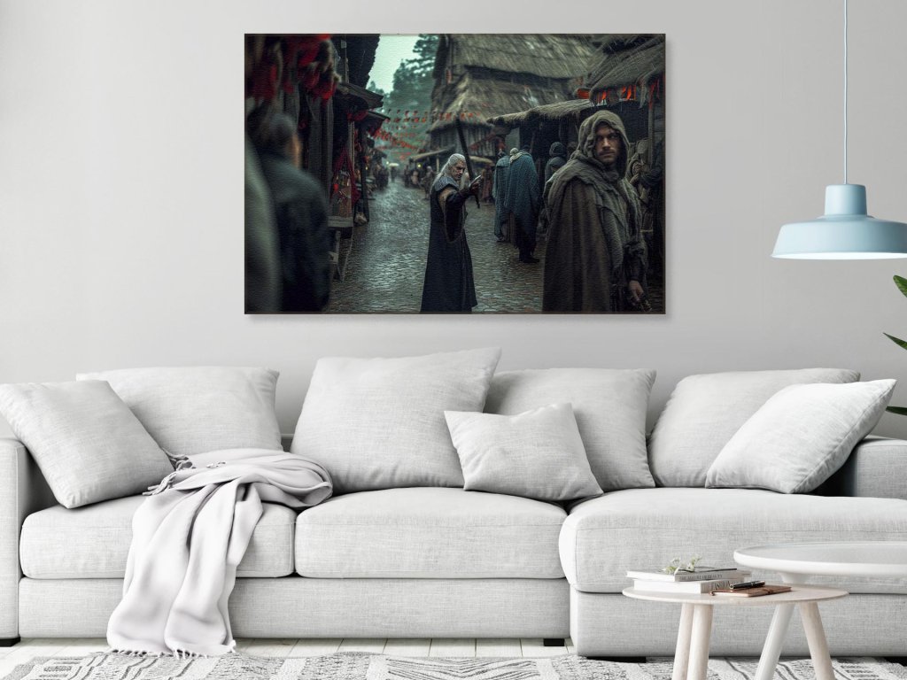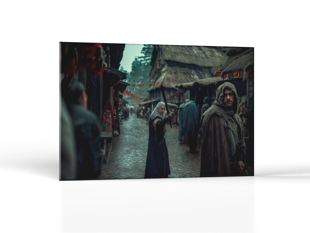 Obraz zachytáva muža so striebornými vlasmi, ktorý sa otáča a pripravuje sa na nejakú akciu s mečom v ruke, zatiaľ čo ho obklopuje dav ľudí v dobových kostýmoch na starodávnom trhovisku. Atmosféra je zamračená a napätá, s tmavými oblakmi a jemným dažďom, čo pridáva k dramatickému nádychu scény. Postavy a architektúra naznačujú, že scéna sa môže odohrávať v stredovekom alebo fantazijnom settingu.