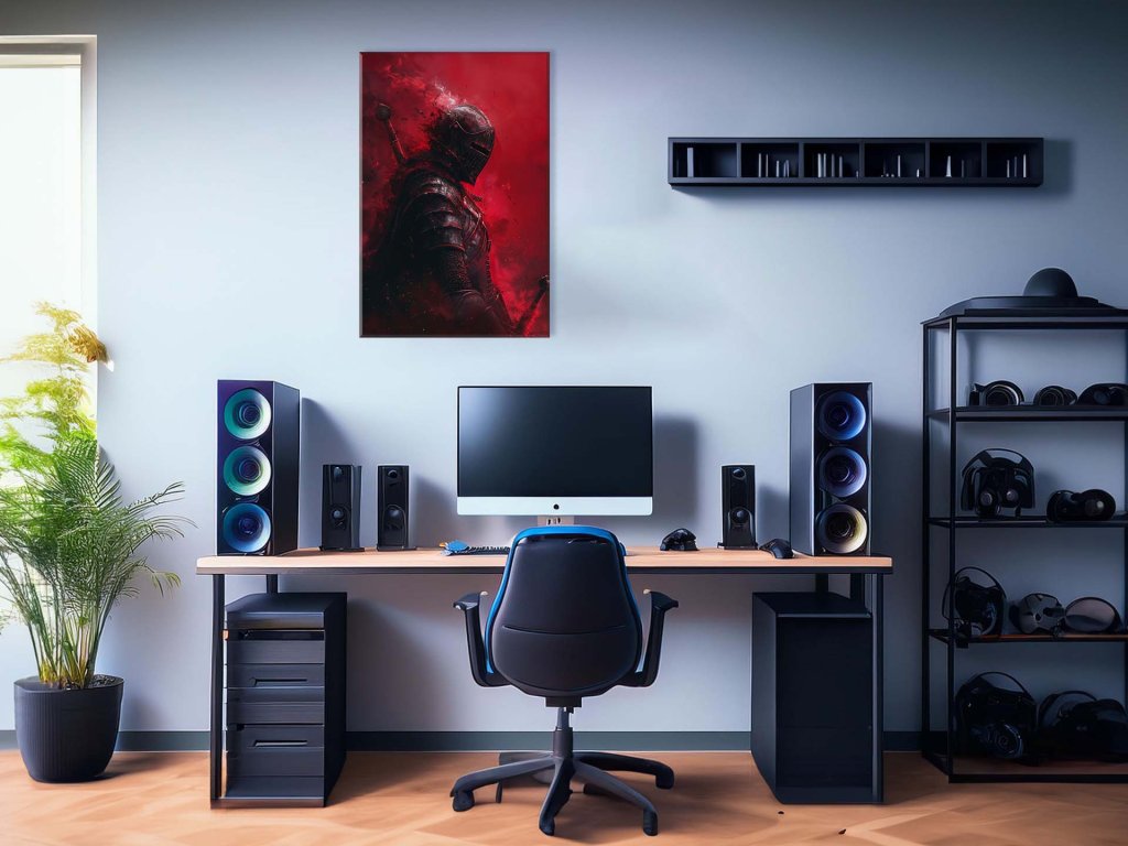 Na obraze je zobrazený rytier v tmavom brnení, ktorý stojí obklopený intenzívnym krvavočerveným svetlom a dymom. Brnenie odráža svetlo, zvýrazňujúc jeho mohutnú a zastrašujúcu siluetu, pričom na pozadí sú viditeľné nejasné stopy boja. Atmosféra je plná napätia a nebezpečenstva, evokujúc pocit, že tento bojovník je pripravený čeliť akémukoľvek protivníkovi, ktorý sa mu postaví do cesty.