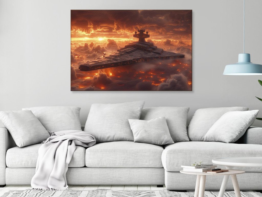 Obrovská vesmírna loď so zložitou štruktúrou sa týči nad žeravými oblakmi, ktoré sú zaliaté zlatistým svetlom zapadajúceho slnka. Loď je detailne vypracovaná, s množstvom osvetlených okien, ktoré naznačujú jej obrovskú veľkosť a komplexnosť. Oblaky pod ňou pripomínajú more lávy, čo dodáva scéne dramatický nádych.