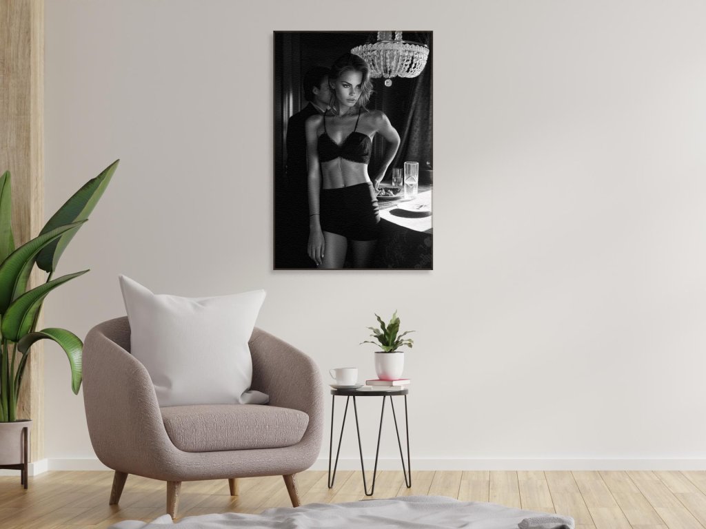 Na obrázku je mladá žena s výrazným líčením, stojaca v luxusne zariadenej miestnosti, s mužom v pozadí. Jej postoj a pohľad sú zvodné, pričom jemne drží pohárik s nápojom. Scéna je osvetlená mäkkým svetlom, ktoré zvýrazňuje zložité detaily jej oblečenia a atmosféru záhadnej elegance.
