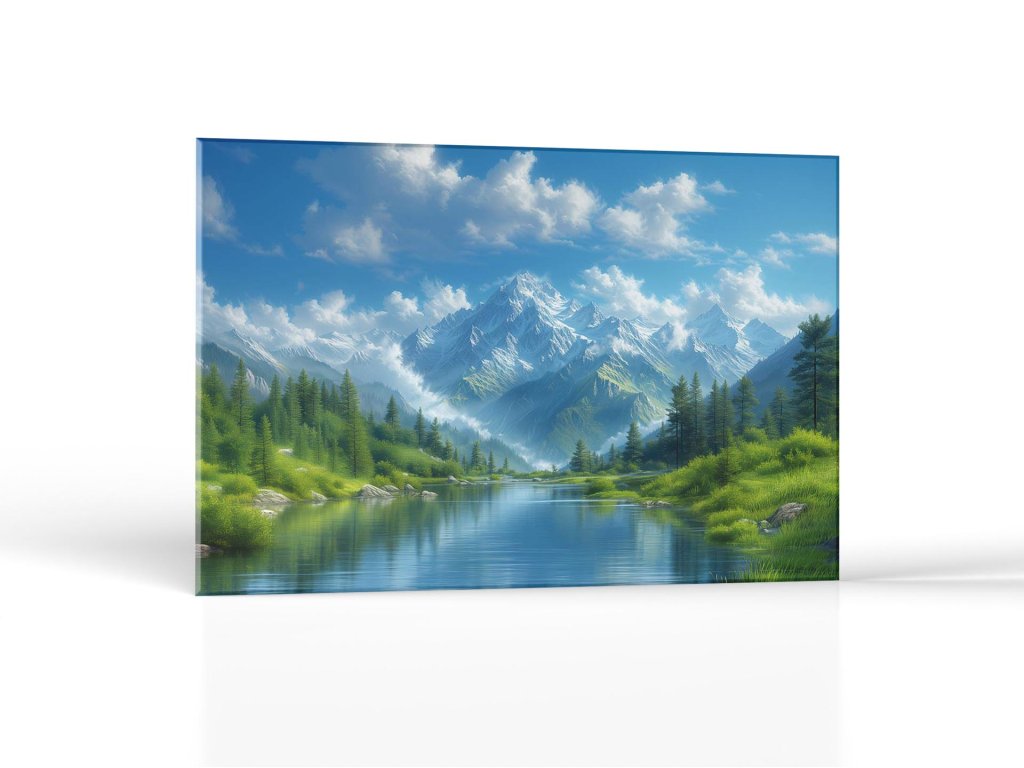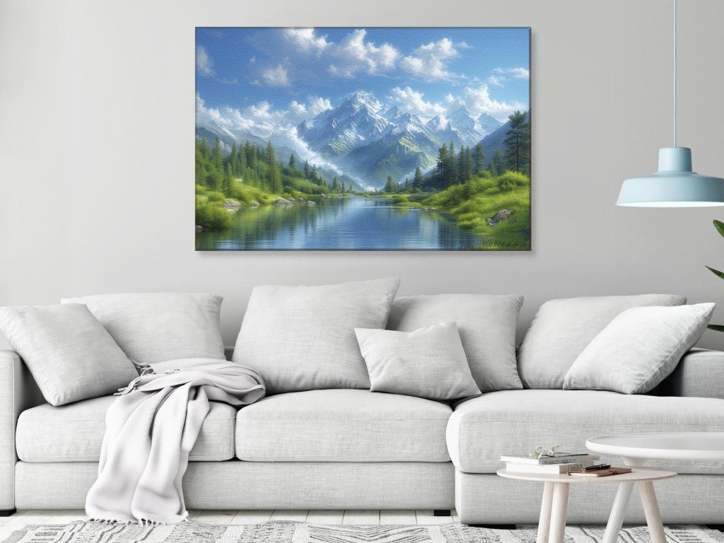 Na obraze je zobrazená pôsobivá horská krajina s čistým modrým jazerom v popredí, obklopená zelenými ihličnatými lesmi. Majestátne vrcholy Álp sú zahalené do mäkkej hmly, čo pridáva celkovej scéne pocit tajomstva a veľkoleposti. Obloha je jasná s rozptýlenými oblakmi, ktoré umocňujú pocit čerstvého a čistého horského vzduchu.