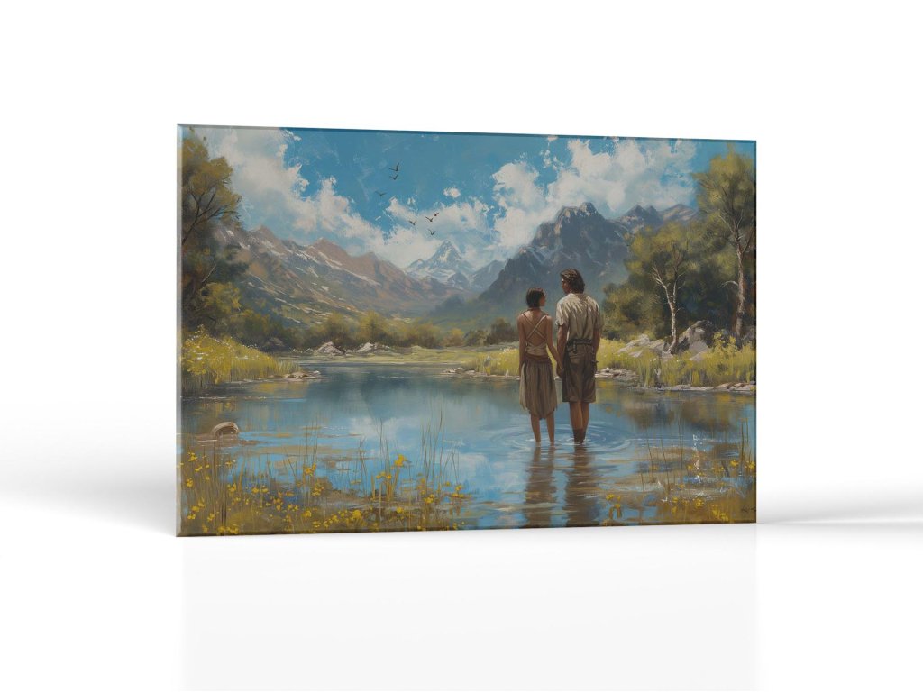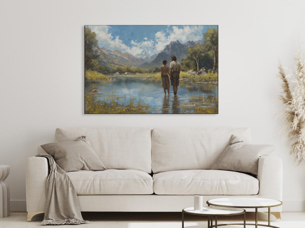 Na obraze sú zobrazené dve postavy stojace v pokojnej vode jazera, obklopené bujnou zelenou vegetáciou a žltými kvetmi, zatiaľ čo v diaľke vynikajú impozantné hory. Slnko jemne osvetľuje scénu a odzrkadľuje sa na hladine jazera, čo vytvára pokojnú a meditatívnu atmosféru. Obrázok je obohatený o letiace vtáky, ktoré dodávajú kompozícii pocit slobody a bezstarostnosti.