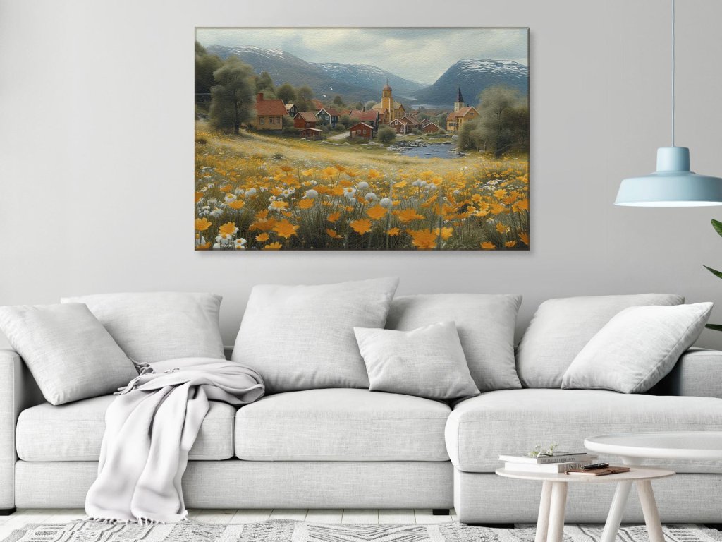 Obraz zobrazuje pokojné horské mestečko, situované v údolí obklopenom zasneženými vrcholkami. Charakteristické drevené domy s červenými strechami vytvárajú teplý a vítajúci dojem, ktorý je umocnený žltými kvetmi na popredí. Pokojná rieka preteká stredom mestečka, pridávajúc scenérii pocit harmónie a pokojnej krásy prírody.