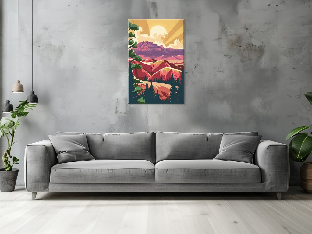 Obraz zobrazuje majestátne hory osvetlené teplým svetlom zapadajúceho slnka. V popredí sú siluety stromov, ktoré rámujú pohľad na farebné úbočia a vzdialené vrcholky. Atmosféra je pokojná a magická, zdôrazňujúca krásu prírodného sveta v jeho večernom svetle.