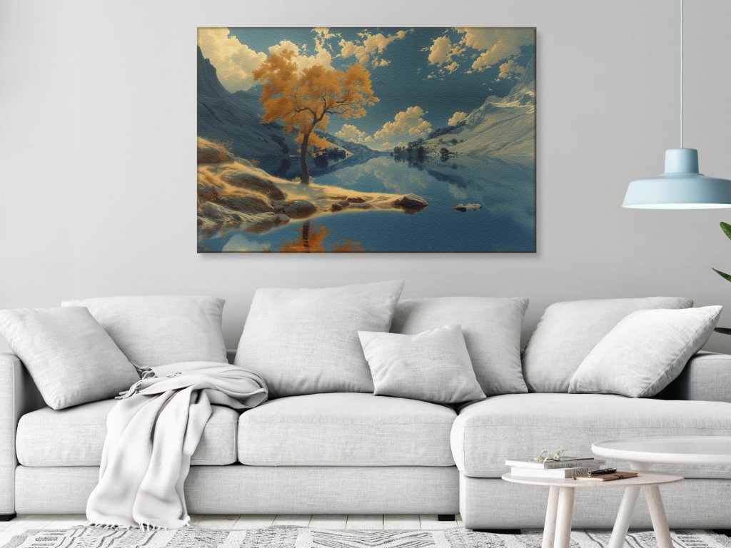 Osamelý strom s oranžovými listami dominuje pokojnému jazeru obklopenému rozsiahlimi horami. Odraz slnka na vode a mäkké oblaky dodávajú scenérii pokojnú atmosféru. Tento obraz je oslavou prírody a jej pokoja, ktorý pozýva k zamysleniu.