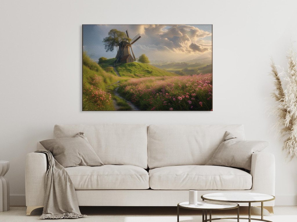 Pôvabný veterný mlyn je situovaný na vrchu zeleného kopca obklopeného kvitnúcimi rastlinami, ktoré sa jemne vlnia vo vetre. Cestička v kopcovitej krajine nás vedie k mlynu, kde mäkké slnečné lúče kreslia zlatožlté čiary na krajine, zatiaľ čo dramatické oblaky zdobia nebo nad idylickou scenériou.