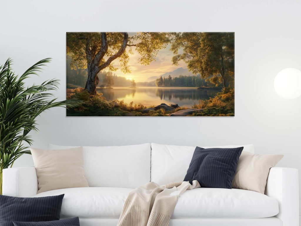 Zlatisté lúče ranného slnka osvetľujú tiché jazero, ktoré odráža okolitú prírodu ako zrkadlo. Stromy lemujúce brehy sa jemne skláňajú nad vodou, zatiaľ čo hory v pozadí dodávajú scéne majestátnosť. Atmosféra je pokojná a upokojujúca, ideálna na rozjímanie v lone prírody.
