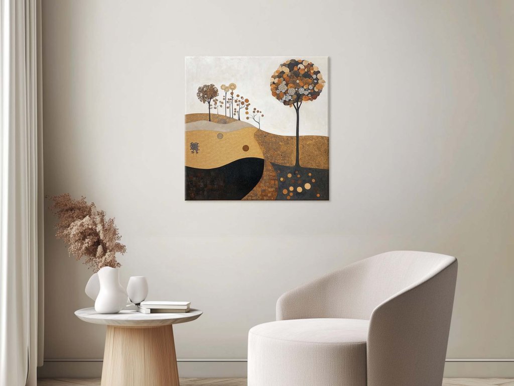 Obraz zobrazuje abstraktnú krajinu s kopcovitým terénom a radom stromov v rôznych situáciách rastu. Tóny hnedej, zlatej a čiernej pripomínajú teplo a hĺbku jesene, pričom výrazné kruhové vzory dodávajú dielu moderný nádych. Celková kompozícia evokuje pocit harmónie medzi prírodou a umením, s dôrazom na textúru a detaily.