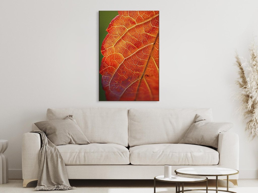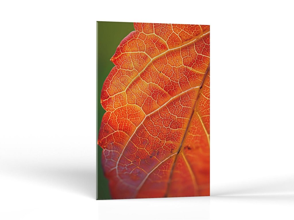 Tento obrázok predstavuje detailný pohľad na list v prechode jeseňou, kde živé červené a oranžové farby zdôrazňujú textúru a detail žilnatého vzoru. Zlatavé svetlo preniká listom, čím podčiarkuje jeho priehľadnosť a krehkosť. Fotografia evokuje pocit zmeny a prírodného cyklu života.