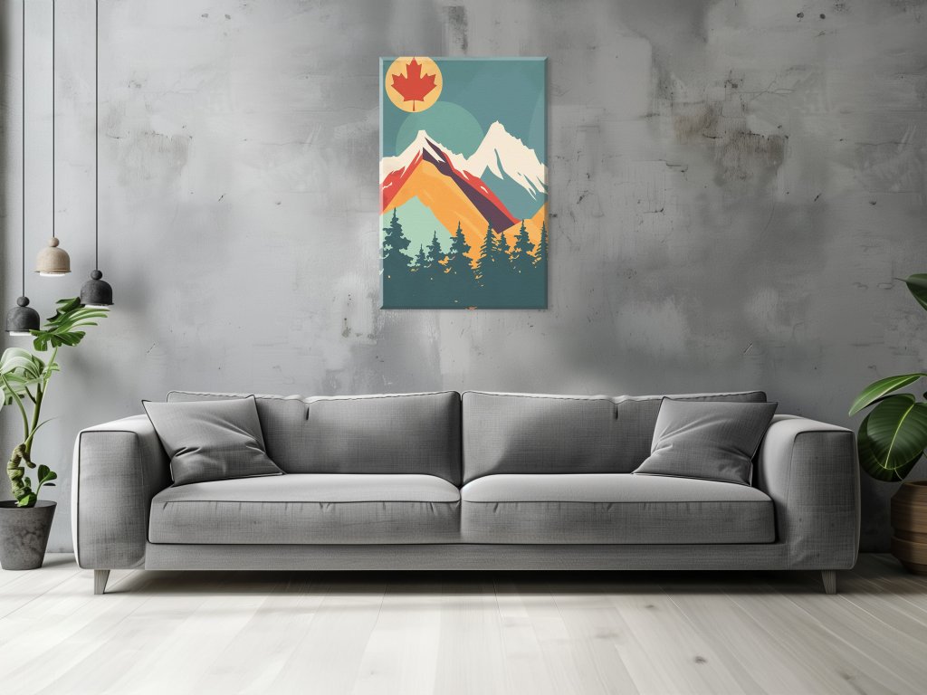 Obraz zobrazuje majestátnu horskú scenériu, kde sa snehom pokryté vrcholy týčia nad hustým lesom. Nad horami svieti veľký kruh s kanadským javorovým listom, symbolom Kanady, čo umocňuje pocit národnej hrdosti a prírodnej krásy tejto krajiny. Celková kompozícia pôsobí harmonicky a zdôrazňuje spojenie medzi prírodou a národnou identitou.