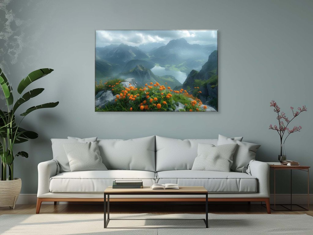 Obraz zachytáva pokojnú scénu s jasnými oranžovými kvetmi, ktoré kontrastujú s mohutnými sivými skalami a zelenými kopcami. V diaľke sa zrkadlí pokojná hladina jazera, nad ktorou sa vznášajú mraky a svitá slnko. Tento pohľad je ukážkou prírodného kontrastu a harmónie, spájajúcej kvetinovú nádheru s divokou horskou scenériou.