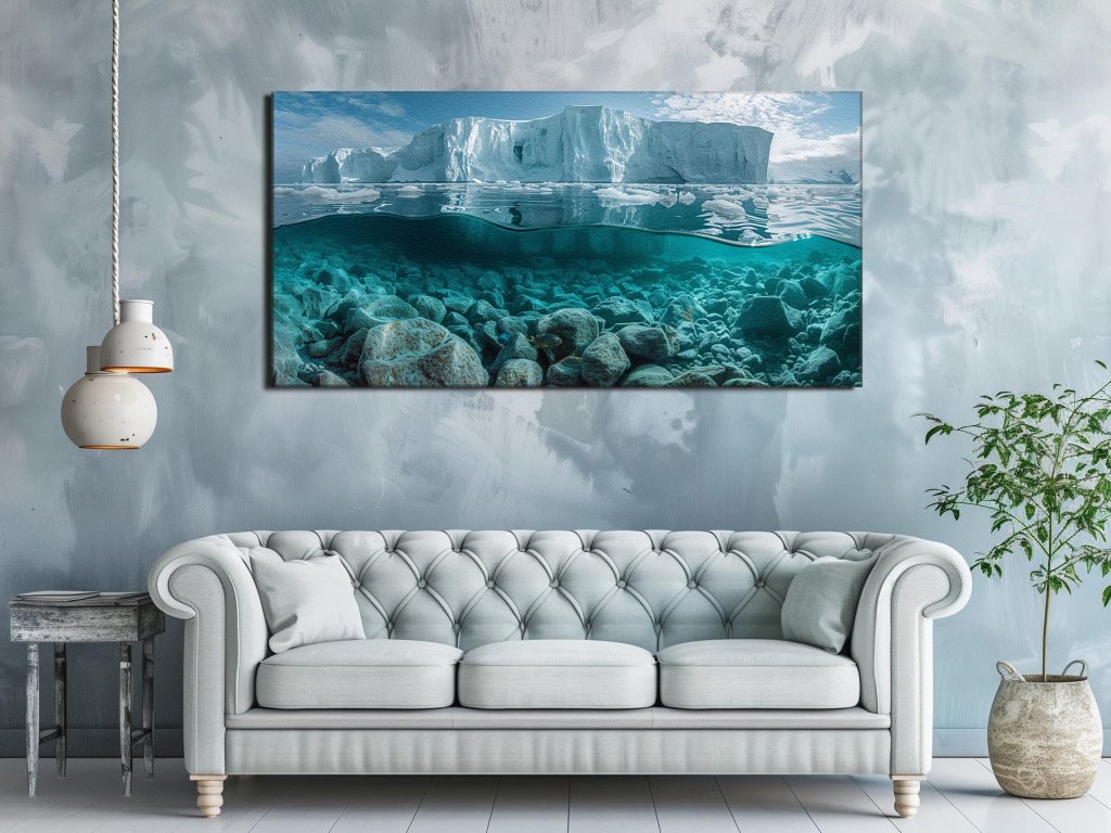 Pohľad na ľadovec, ktorý dominuje horizontu nad hladkou morskou hladinou. Pod vodou je vidieť úchvatné detaily kamenného dna a osamelé ryby plávajúce medzi kameňmi. Čistota vody umožňuje vidieť krásu podmorského sveta, ktorý kontrastuje s bielou majestátnosťou ľadovca.