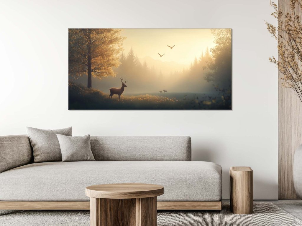 Obraz zachytáva pokojné ráno v prírode, kde jemné lúče slnka osvetľujú lesnú čistinku. Jeleň majestátne stojí na okraji svetla, zatiaľ čo v diaľke sú viditeľné ďalšie lesné zvieratá a vtáky stúpajú do neba. Atmosféra obrazu evokuje pokoj, rovnováhu a hlboké spojenie s divokou prírodou.