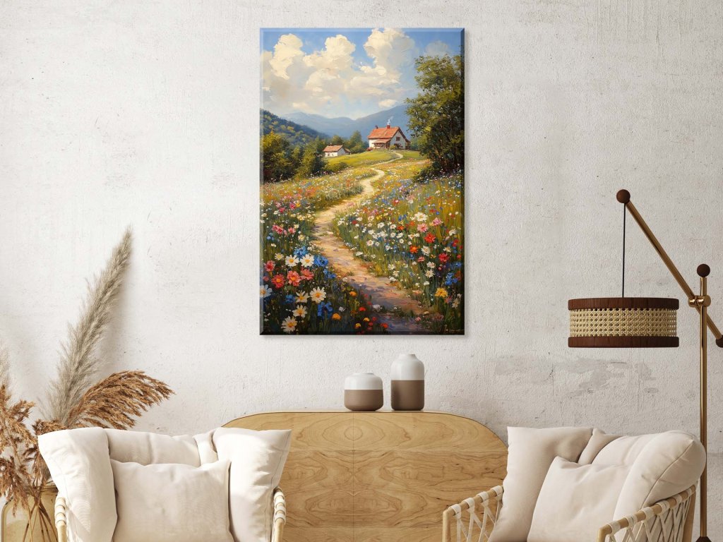 Obraz zobrazuje pokojnú krajinu s lúkou plnou pestrých kvetov, cez ktorú sa vinie úzky chodník vedúci k idylickému domu na kopci. V pozadí vidno hory a oblaky, ktoré dodávajú scéne atmosféru pokoja a rovnováhy. Teplé svetlo slnka osvetľuje celú krajinu a zdôrazňuje krásu prírodného prostredia.