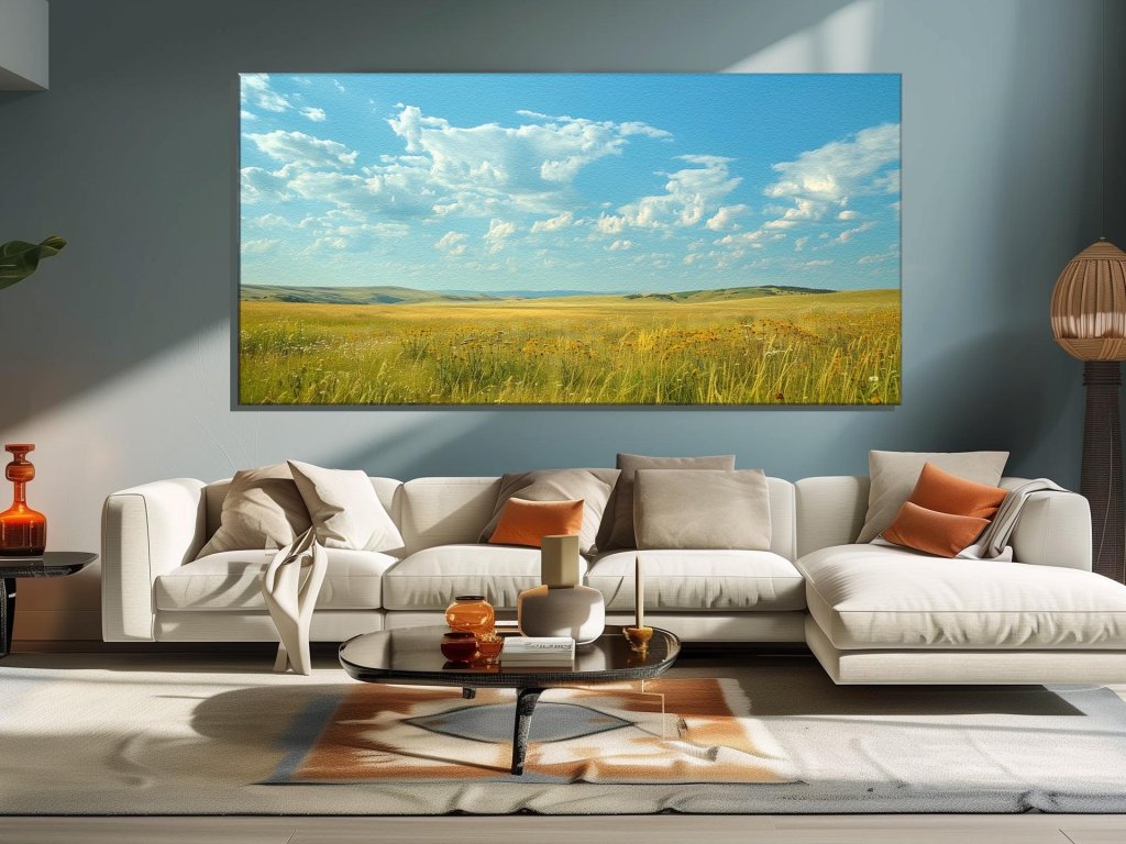 Rozľahlá planina zahalená v teplých pastelových farbách, kontrastujúca s jemným modrým nebom a bielymi oblakmi. Nenápadné kvety a tráva na popredí vytvárajú pokojný dojem prirodzeného prostredia. Na obzore sa tiahnu pahorky, ktoré dotvárajú panoramatický výhľad na túto pokojnú prírodnú scenériu.