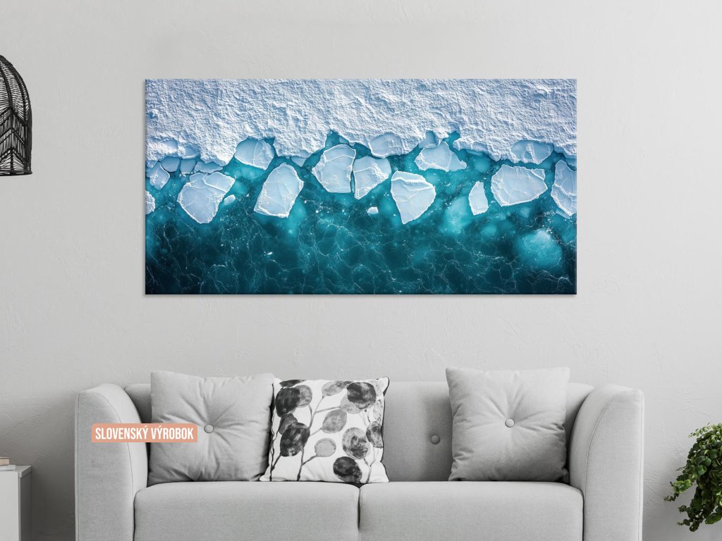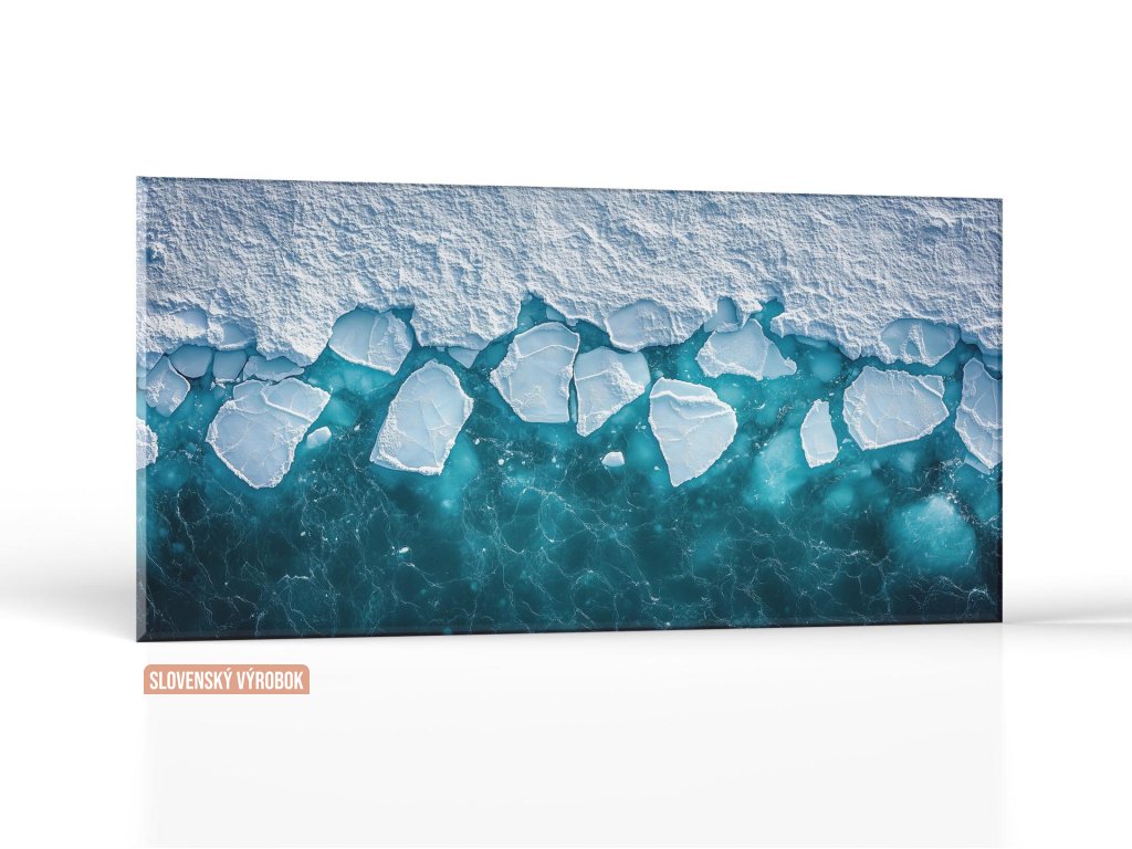 Obraz zachytáva dramatický prechod medzi masívnou ľadovou masou a otvoreným oceánom, kde sa jednotlivé kryhy začínajú trhať a oddeľovať. Studená farebná paleta bielej a tyrkysovej zdôrazňuje chlad a krehkosť arktickej krajiny. Výjav vyvoláva pocit ticha, vzdialenosti a zároveň pripomína silu prírodných cyklov a klimatických zmien.
