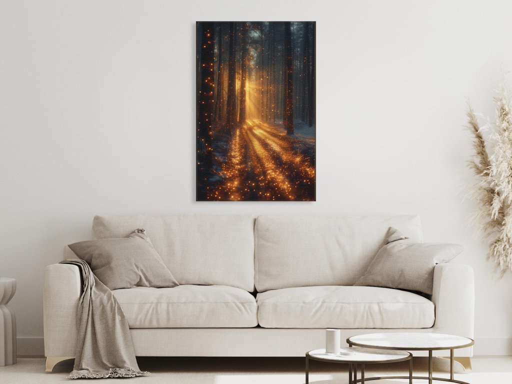 Obraz zobrazuje pokojnú scénu z lesa, kde jemné slnečné svetlo preniká cez husté stromy a vytvára tajomnú a očarujúcu atmosféru. Zlatisté lúče osvetľujú cestičku a lesk sa odráža od jemných častíc vo vzduchu, čo vytvára dojem ako z rozprávky. Vzdialené slnko na obzore dodáva celej scéne pocit tepla a dôvernosti.