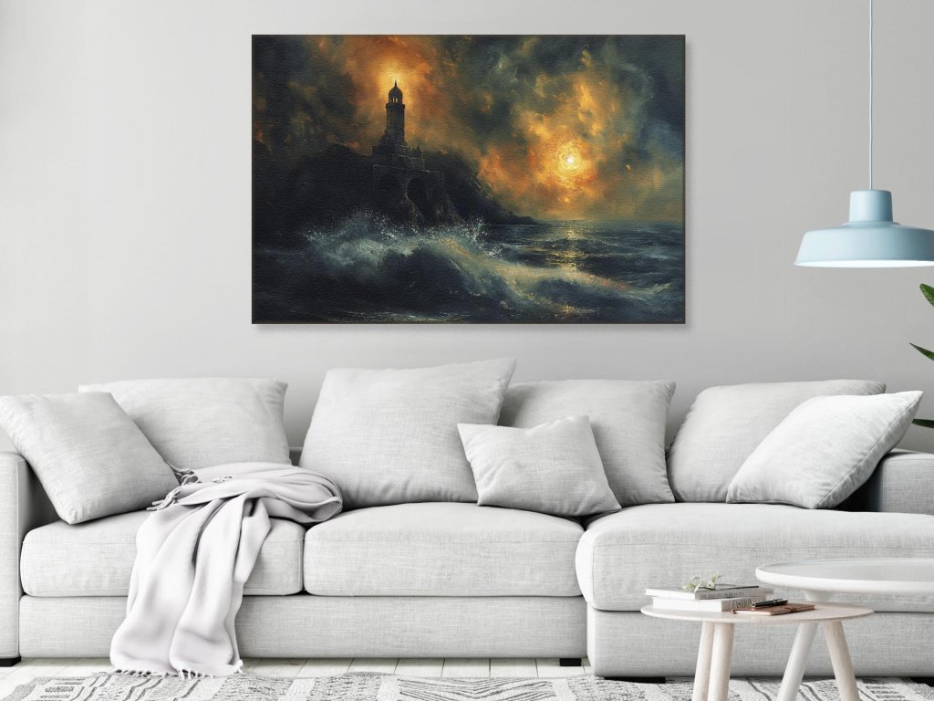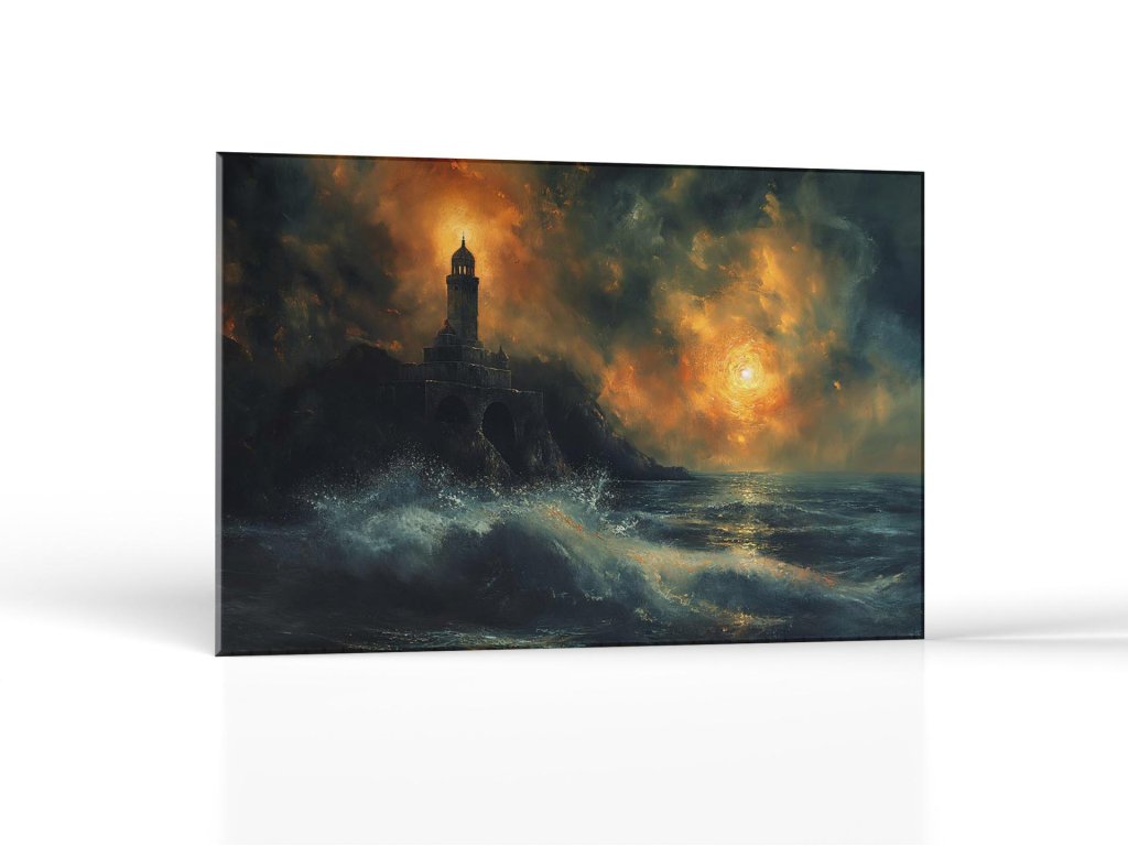 Na obraze je zobrazený starodávny maják postavený na skalnatom pobreží, ktorý čelí náporu mohutných vĺn v dramatickej morskej búrke. Obloha je prenikavá s oranžovými a zlatými odtieňmi slnečného západu, ktoré kontrastujú s tmavými, búrlivými mrakmi. Scéna vyžaruje silu a odolnosť v tvári prírodných živlov.