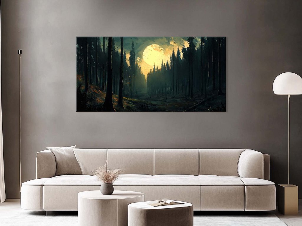 Tento obraz zachytáva hustý tmavý les, v ktorom stromy stúpajú vysoko k oblohe, pričom les je osvetlený svetlom obrovského mesiaca v splne. Mesačný svit preniká medzi stromami, čo vytvára dramatickú atmosféru plnú tajuplného pokoja. Kombinácia svetla a tieňa zvýrazňuje surovú krásu prírody a evokuje pocit mystiky a osamelosti uprostred temného lesa.