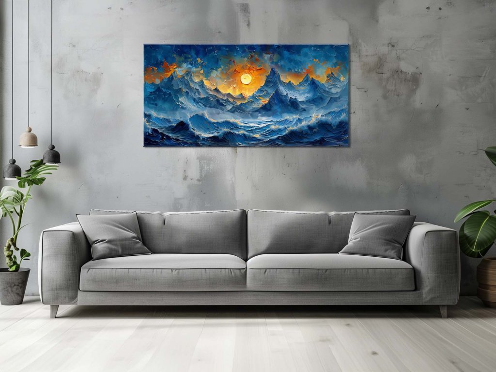 Tento obraz zobrazuje vlny a hory, ktoré sa zdajú byť jedno s druhým pod dramatickým, víriacim nebom. Intenzívne modré a oranžové farby sa miešajú, vytvárajúc pocit pohybu a energie, kým žiarivé slnko dodáva scéne teplé svetlo. Vizuálne týmto spája nebeskú expanzívnosť s divokou silou prírody, čo je zachytené expresívnymi ťahmi štetca.