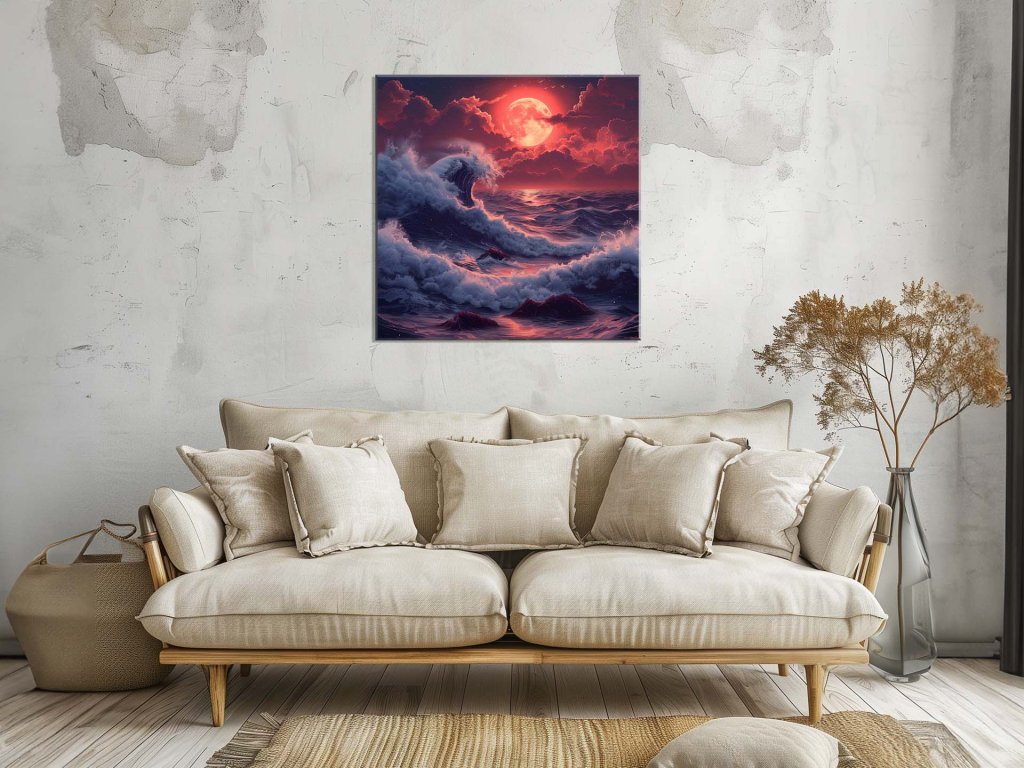 Na tomto obraze je zobrazené vzrušujúce námorné prostredie s mohutnou vlnou, ktorá sa valí nad tmavým oceánom pod obrovským červeným mesiacom. Obloha je plná hlbokých odtieňov červenej a modrej, ktoré vytvárajú mystickú a tajomnú atmosféru. Vlny sú dramaticky ilustrované s bielou penou, čo pridáva na dynamike a silnom vizuálnom efekte obrazu.
