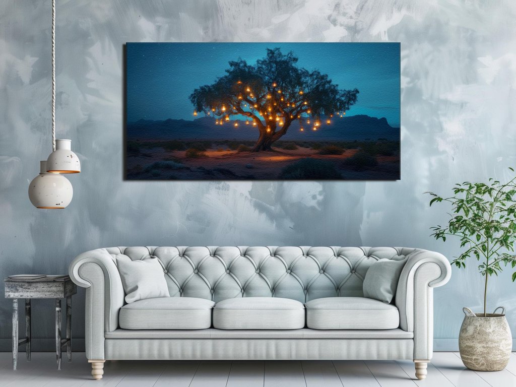 Strom s rozkonárenou korunou je osvetlený množstvom závesných lámp, ktoré dodávajú scéne magickú atmosféru. Neďaleko sú pozorovateľné pahorky a slabo sa vynímajúce hory v pozadí pod hviezdami. Scéna je zaliata v pokojných modrých a oranžových tónoch, ktoré podčiarkujú ticho a pokoj púšte v noci.