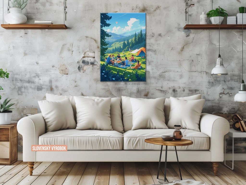 Tento obraz zobrazuje šťastnú rodinu, ktorá trávi slnečný deň na pikniku v nádhernej horskej krajine. Rodina sedí na deke, okolo nich sú rozložené jedlá a nápoje, a v pozadí je vidieť stan a deti hrajúce sa na lúke. Modrá obloha a vzdialené hory dodávajú scéne pocit pokoja a radosti.