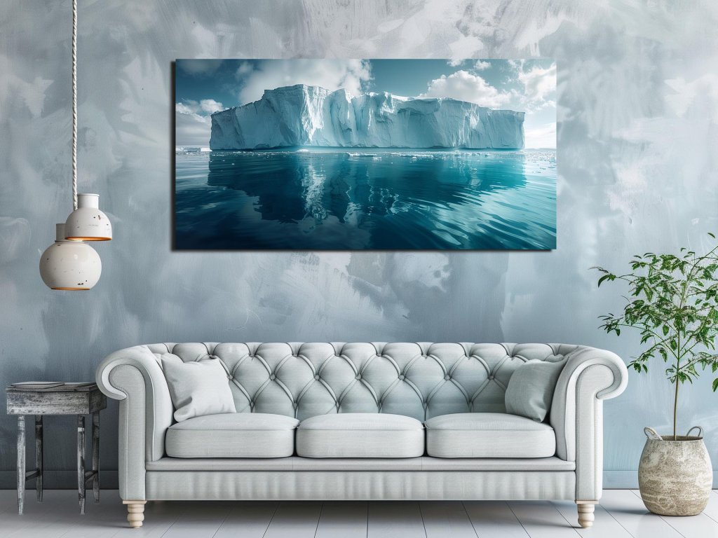 Monolitický ľadovec, ktorý vystupuje z tichého azúrového mora, dominuje scéne pod jasnou oblohou s roztrúsenými oblakmi. Odrazy a tóny modrej na vodnej hladine pridávajú k pokojnému, ale majestátnemu charakteru obrazu. Slnečné svetlo prenikajúce oblohou dodáva kompozícii dynamický a živý rozmer.