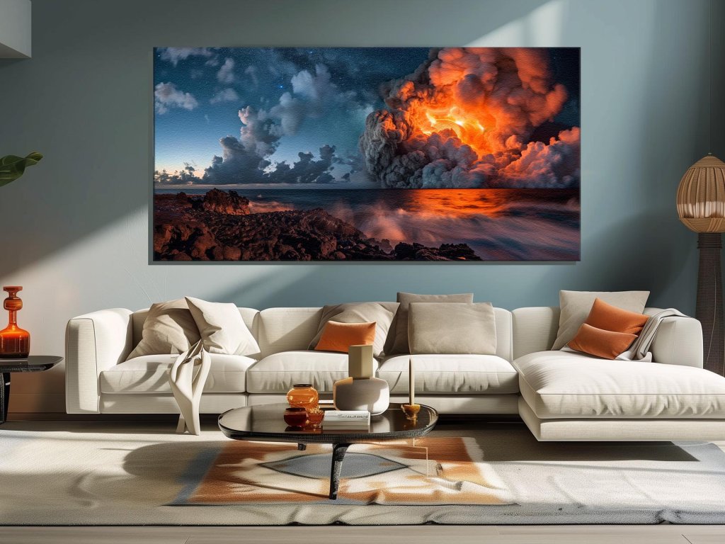 Majestátna sopka vypúšťa žiarivú lávu a hustý dym do vzduchu, čo vytvára kontrast medzi oranžovým jasom a chladnejším modrým nebom. Svetlo od lávy osvetľuje tmavé horniny v popredí, zatiaľ čo hviezdy na jasnej oblohe pridávajú scéne hlavolamný rozmer. Scéna je svedkom ničivej krásy prírodných síl.