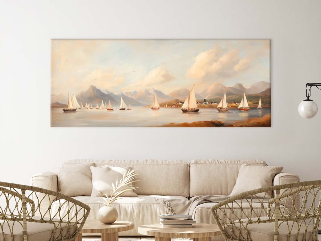 Obraz zobrazuje idylickú scenériu, kde sa plachetnice jemne plavia po pokojnej hladine jazera. V pozadí sa týčia majestátne hory, ktoré dodávajú krajine dramatický, no zároveň harmonický charakter. Atmosféra obrazu vyžaruje pokoj a krásu prírody, pričom plachetnice symbolizujú voľnosť a spojenie človeka s vodným živlom.