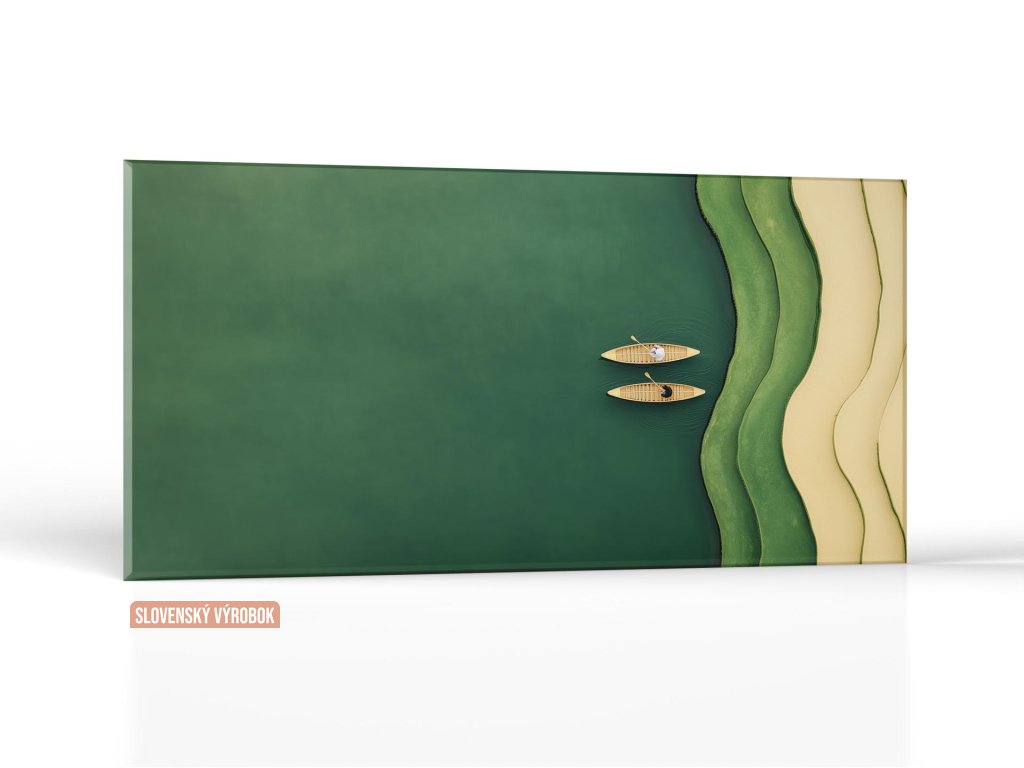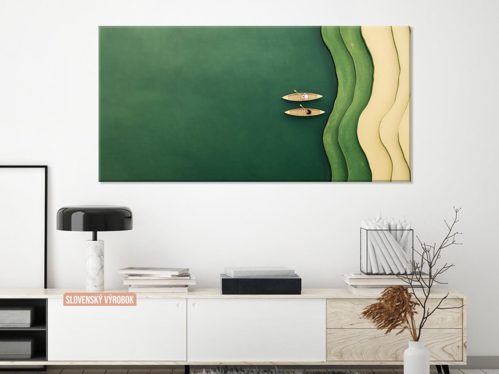 Tento obraz z vtáčej perspektívy zachytáva harmonickú scénu s dvoma člnmi pomaly sa pohybujúcimi po hladine pokojnej zelenej vody. Na pravej strane sa tiahnu zaoblené línie ryžových polí v jemných odtieňoch žltej a zelenej, ktoré pripomínajú vrstvy krajiny. Minimalistická kompozícia zdôrazňuje rytmus prírody a tichý pohyb, pôsobiaci meditatívne a vyvážene.