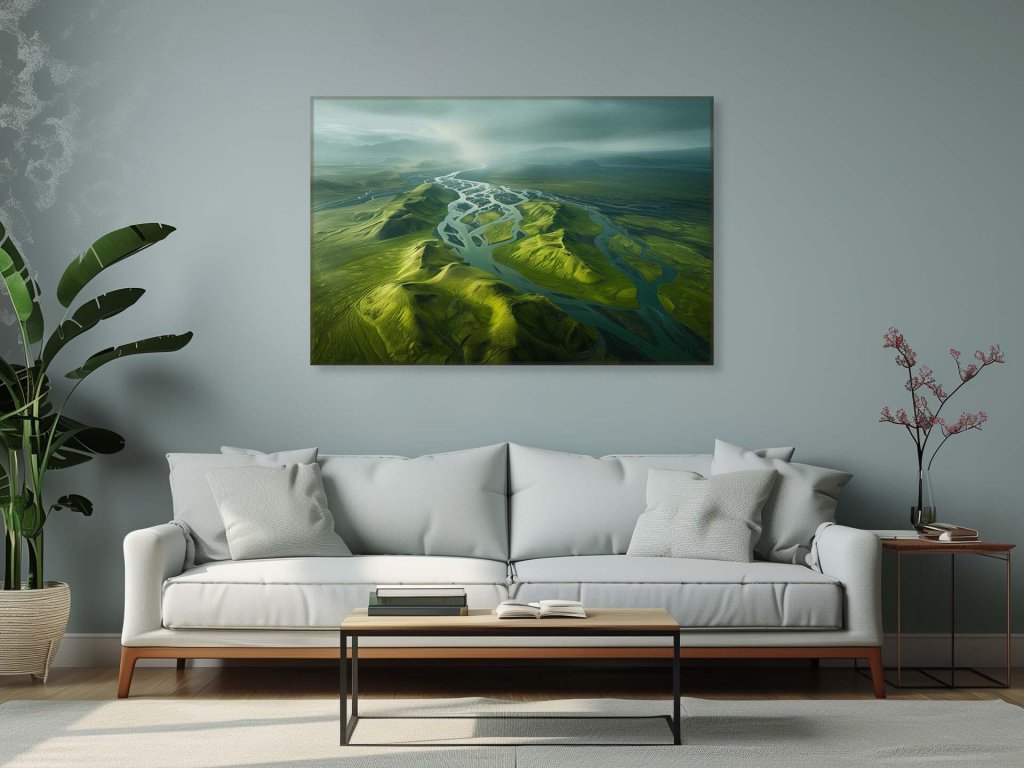 Obraz zachytáva jemné svetlo slnka, ktoré preniká cez mraky na rozľahlú krajinu, kde meandrujúce riečne ramená oddeľujú zelené kopce. Kontrast medzi jemnými tónmi zelenej a temnými odtieňmi rieky vytvára hypnotický vizuálny efekt, zatiaľ čo hra svetla a tieňov dodáva scenérii hlboký a dynamický vzhľad. Tento obraz pôsobí pokojne a vyvážene, pričom zvýrazňuje krásu prirodzenej krajiny.