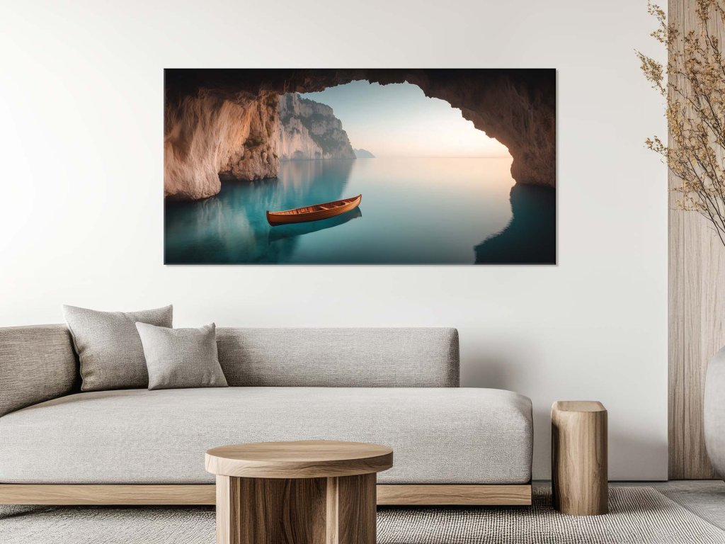 Tento obraz zachytáva nádherný prírodný úkaz, kde sa tichá jaskynná lagúna otvára do nekonečného horizontu. Drevený čln sa vznáša na pokojnej vodnej hladine, odrážajúc jemné farby neba a majestátne skalné útesy. Zlatisté svetlo presvitajúce cez vstup do jaskyne dodáva scéne mystický a upokojujúci nádych, ktorý evokuje pocit harmónie a odlúčenia od uponáhľaného sveta.