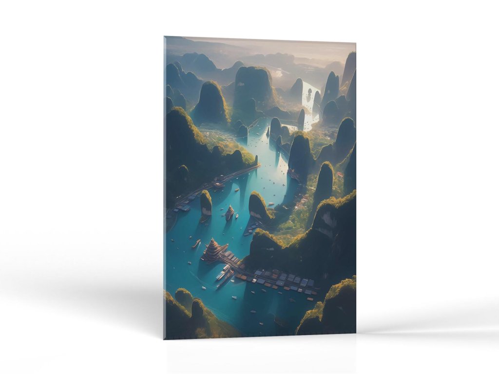 V zátoke sa vyníma rušný prístav, po ktorom jazdia autá po dlhej mostnej konštrukcii a okolo neho sú zakotvené lode s červenými plachtami. Zelené vrchy obklopujúce záliv dodávajú scenérii pocit odľahlého raja. Hra svetla a tieňov v kombinácii s modrými odtieňmi vody a neba vytvára pokojný a vyvážený obraz.