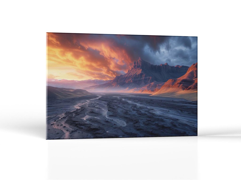 Púšť ožíva pod ohnivým západom slnka, kde mäkké svetlo osvetľuje vrcholy a zárezy skalných útvarov. Jemné riečisko odhaľuje svoju cestu skrz púšť, ktorá sa zrkadlí v miernej vode. Hra svetla a tieňov dodáva scenérii pocit tajomna a nekonečnej divočiny.
