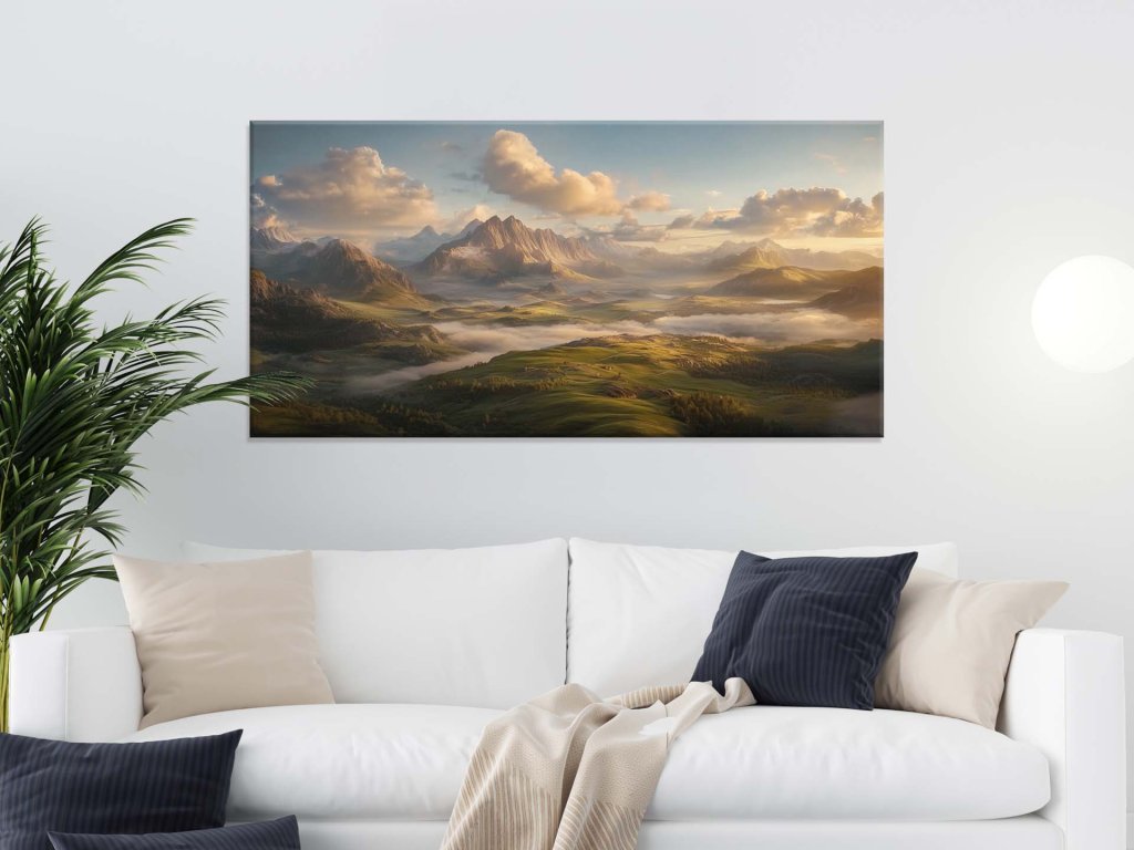 Obraz zachytáva pokojné horské údolie počas východu slnka, kde sa hory majestátne dvíhajú nad zelenými lúkami. Mäkká hmla obklopuje krajinu, čím vytvára mystickú atmosféru a kontrast so zlatistými lúčmi slnka. Tento výjav evokuje pocit harmónie, slobody a krásy prírody v jej najčistejšej podobe.