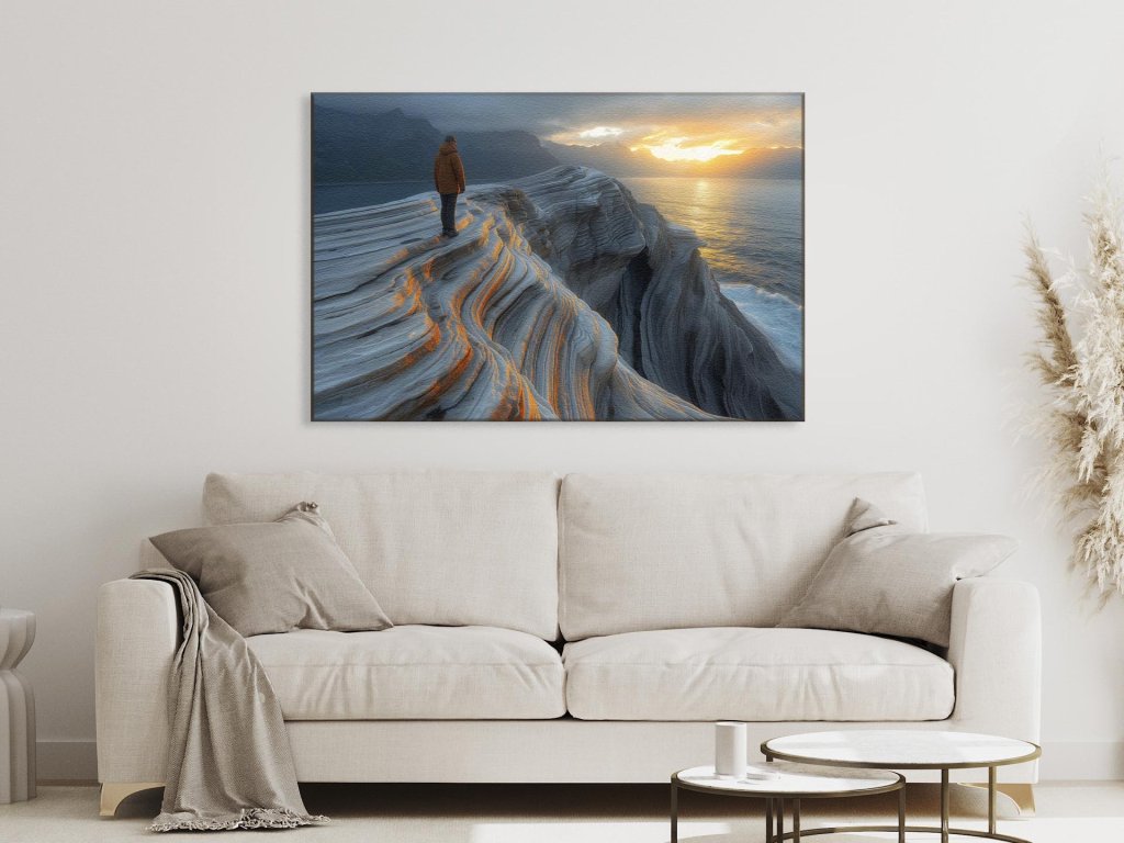 Postava stojí na zvlnených vrstvách skalného útesu, ktoré sa tiahnu až k hladine mora. Úchvatné záhyby skalnatého masívu sa zahaľujú do zlatých a oranžových odtieňov zapadajúceho slnka. Scéna je obohatená o dramatiku vzdialených hôr a hĺbku prichádzajúceho večera.