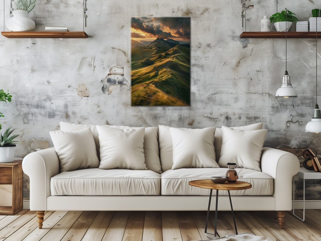 Tento obraz zachytáva úchvatný pohľad na kopce a údolia, ktoré sú osvetlené teplými lúčmi zapadajúceho slnka. Svetlo prechádza cez dramatické oblaky, čím vytvára nádhernú atmosféru. Svahovité kopce a ich tieňovanie zvýrazňujú prírodnú krásu a majestátnosť krajiny.