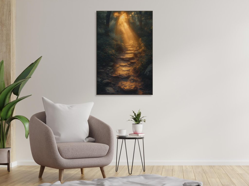 Scéna zobrazuje lesnú cestičku, pokrytú kameňmi, ktorá vedie k fascinujúcemu zdroju svetla, akoby do inej dimenzie. Lúče slnka prenikajú hustými stromami a vytvárajú tajomnú a magickú atmosféru. Cesta a okolitá vegetácia sú osvetlené teplým, mäkkým svetlom, ktoré dodáva celému výjavu pocit tajomstva a pokoja.