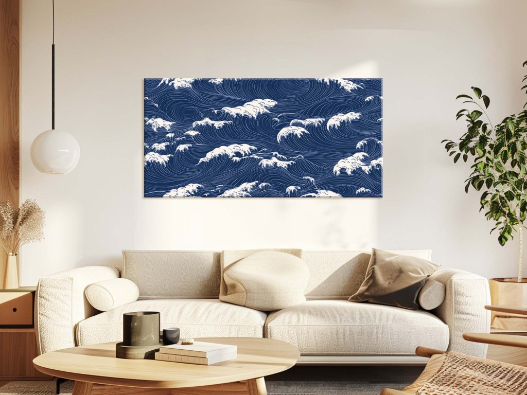 Tento obraz zachytáva divoký pohyb oceánskych vĺn vo forme elegantných línií a kriviek. Biely penový hrebeň vĺn kontrastuje s hlbokou modrou farbou mora, čo vytvára vizuálny rytmus plný energie a pohybu. Každá vlna na obraze sa javí ako súčasť nekonečného cyklu, čím pripomína nezadržateľnú silu prírody.