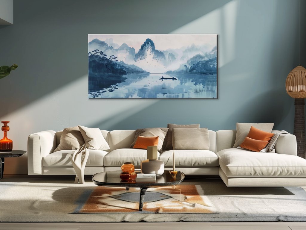 Obraz zobrazuje tichú rieku, na ktorej sa plaví loďka s dvoma osobami. Okolo rieky sa týčia majestátne hory zahalené v jemnej hmle, ktorá dodáva scéne mystickú atmosféru. Celý obraz je ladený do modrých a sivých tónov, čo podčiarkuje pokoj a harmóniu tohto nádherného prírodného výjavu.