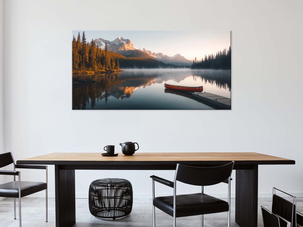 Tento obraz zachytáva pokojnú rannú atmosféru horského jazera, kde sa odraz majestátnych hôr a ihličnatých lesov zrkadlí na hladine. Hmla sa vznáša nad vodou, zatiaľ čo ranné slnko jemne osvetľuje scenériu teplými tónmi. Na drevenom móle čaká červené kanoe, lákajúce na dobrodružnú plavbu po tichých vodách.