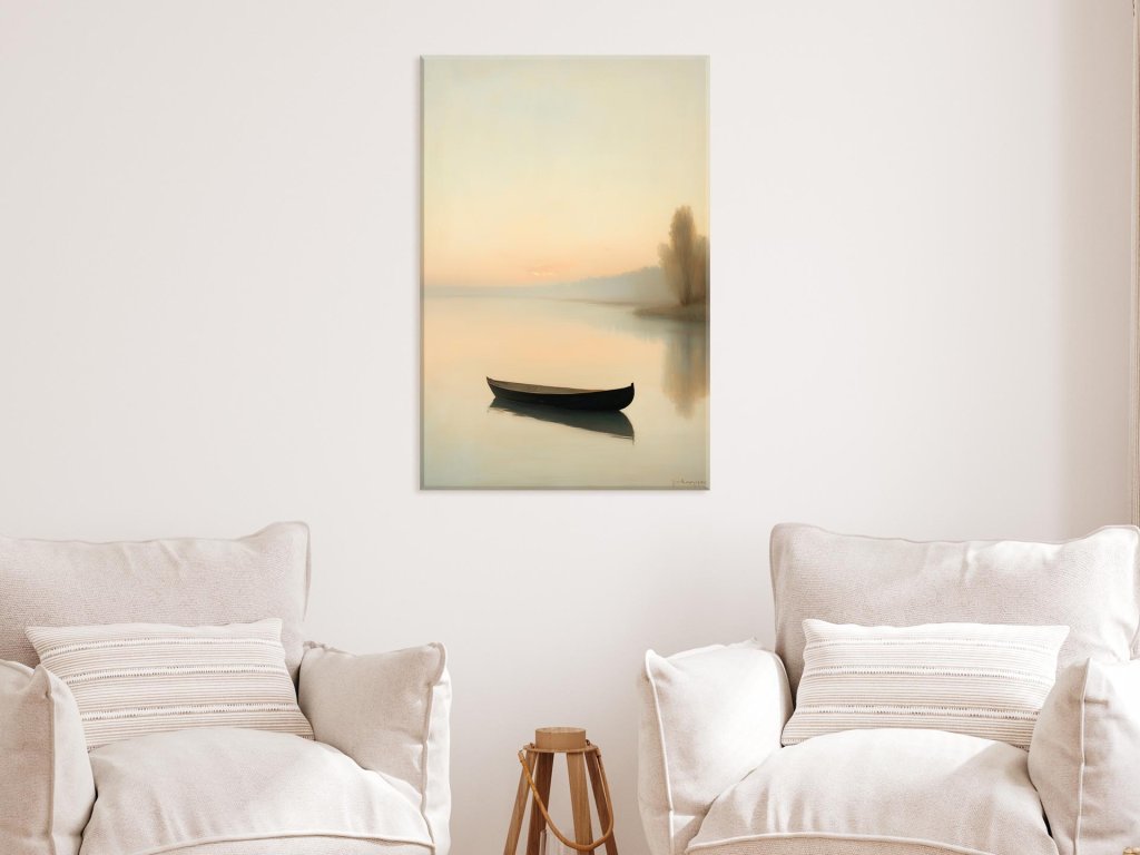 Obraz zachytáva pokojný súmrak pri jazere, kde ticho narúša len osamelý čln plávajúci na pokojnej hladine. Jemné pastelové tóny oblohy a zrkadlenie vo vode vytvárajú atmosféru hlbokého pokoja a kontemplácie. Kompozícia pôsobí minimalisticky, no zároveň emocionálne silno, ako pozvanie na stíšenie a vnútorné zastavenie.