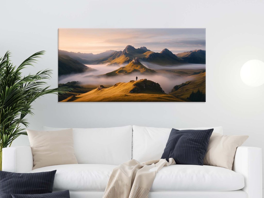 Obraz zachytáva pokojné ranné svetlo, ktoré sa rozlieva po zlatých pahorkoch a osvetľuje hmlu plaziacu sa dolinami. V diaľke sa majestátne týči starobylý hrad obklopený tichými horami, ako strážca dávnych tajomstiev. Postava v popredí, stojaca na vyvýšenine, vnáša do scény ľudský rozmer a vytvára dojem kontemplácie či predzvesti cesty.