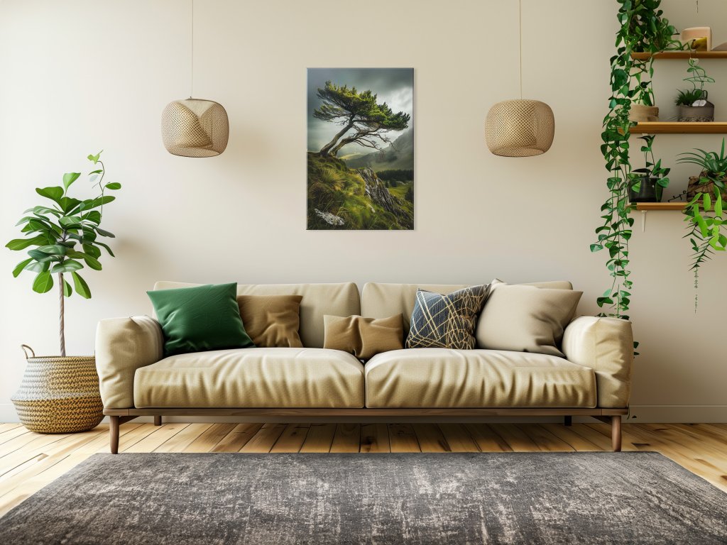 Na obraze vidíme strom, ktorý sa prispôsobil drsným podmienkam a silným vetrom, ktoré ho ohýbali, až získal svoj charakteristický tvar. Tento odolný strom stojí na okraji skalnatého útesu, obklopený bujnou zeleňou a trávou, ktorá sa jemne vlní vo vetre. V pozadí sa rozprestiera malebná krajina s kopcami a údoliami, ktorá vytvára nádherný kontrast k dramatickému nebu.