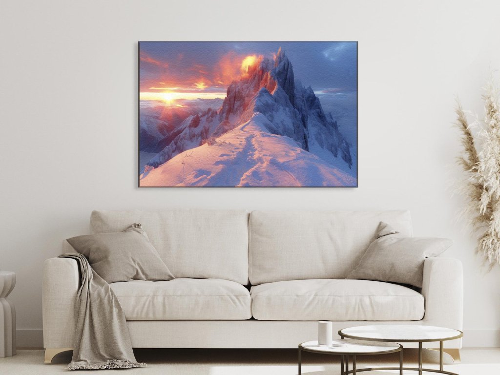 Zasnenejšie než hory obklopené mäkkými oblakmi, kde vrchol hory osvetľuje ráno slnka. Dramatické farby neba s prechodmi od modrej po oranžovú dodávajú scéne pôsobivý kontrast, zatiaľ čo osamelý horský štít odhaluje svoje zasnežené svahy a ostré hrany. Je to pohľad, ktorý vyvoláva pocit divokosti a pokojnej majestátnosti prírody.